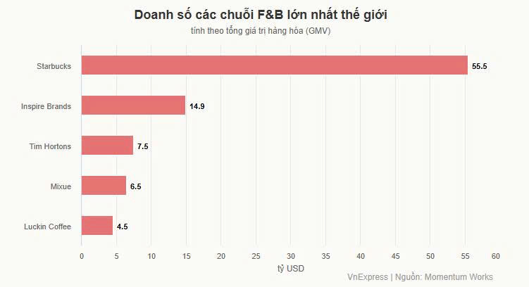 Chỉ sau một năm, Mixue từ vị trí thứ 4 vươn lên chuỗi F&B lớn nhất thế giới. Nguồn: Momentum Works